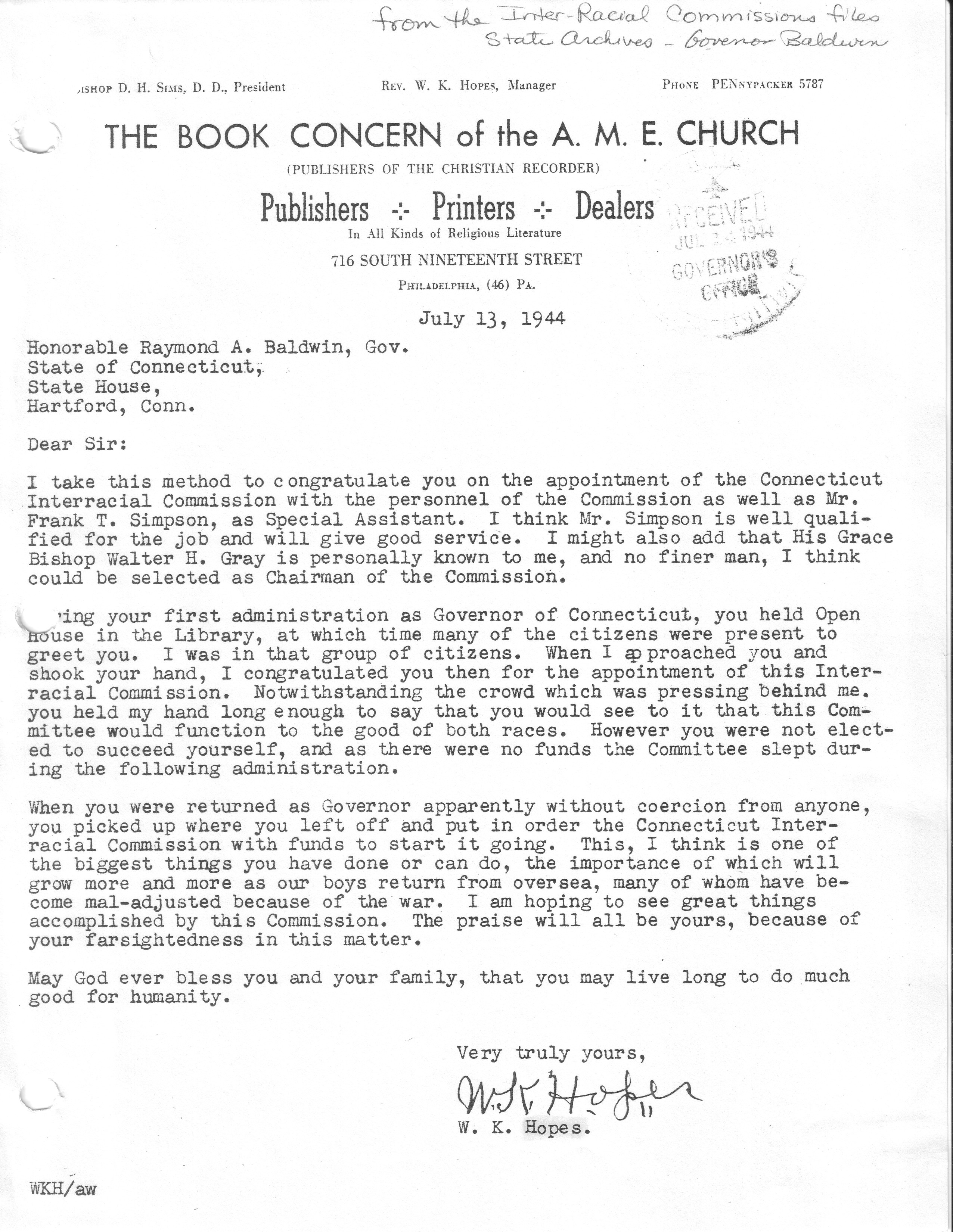 1944 letter to Governor Baldwin from W. K. Hopes